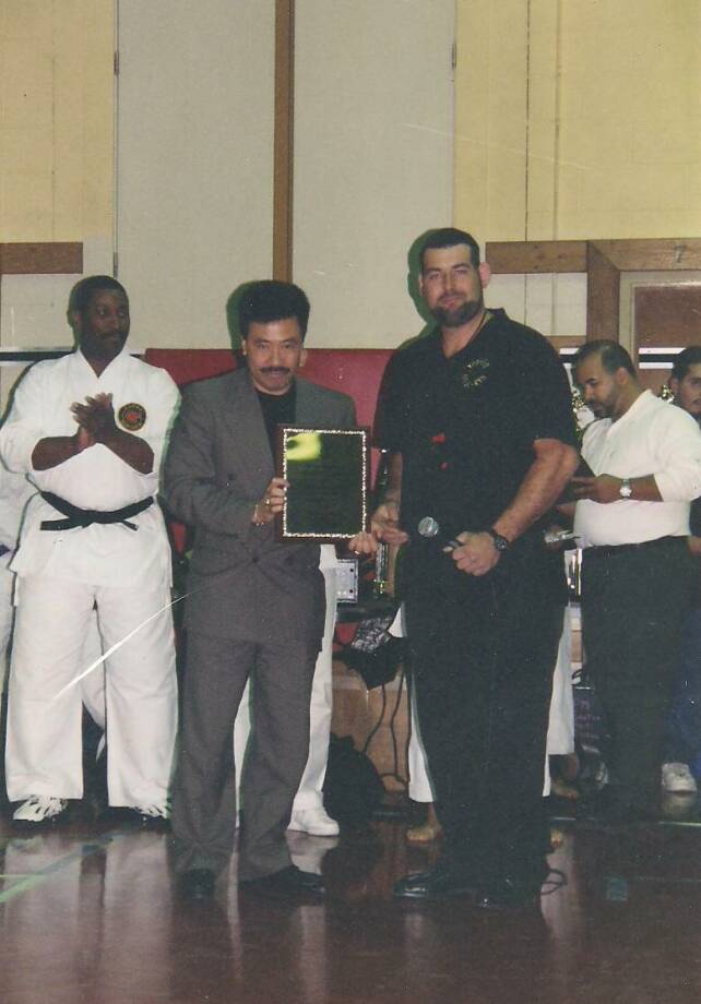 Kyoshi Anthony Lau receives an award from Sensei John Benedict.